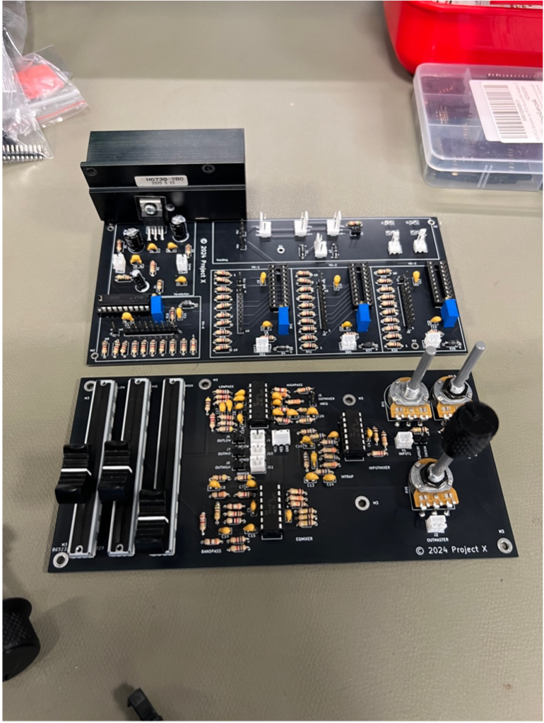 Na de Herfst vakantie zijn wij direct begonnen met het solderen van de PCB en dat verliep goed. Ik was solderen, Dean drukte alle onderdelen in het PCB en Ismail controleerde alle weerstanden en condensators op hun waarde (Figuur 3). In deze Periode was Badi veel ziek, daar liepen wij een beetje tegenaan aangezien er problemen waren met de VU-meter op het PCB.