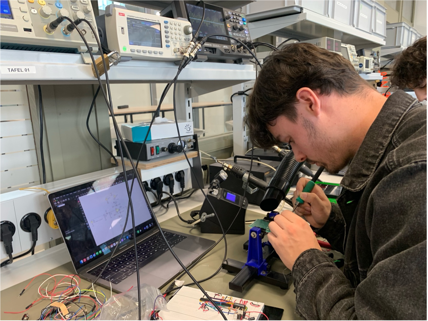 Hierna zijn wij onze BOM gaan opzetten en hebben wij overlegt waar wij dit gingen bestellen. Omdat ik een Kvk nummer had hebben wij besloten dit te bestellen op Reichelt, daar was het het goedkoopst. Na het solderen van de perfboards hebben wij deze getest. Mijn perfboard deed het helaas niet in een keer, samen met mijn groepje zijn we het probleem gaan zoeken en ontdekte ik dat ik een Elco condensator verkeerd had aangesloten. Zodra alle units werkte hebben wij deze aan elkaar aangesloten zoals het op de PCB’s zou zijn (Dean en Ismail | Badi en Rik). Dit werkte gelukkig meteen, door deze enthousiasme hebben wij meteen de PCB’s besteld die wij hadden ontworpen.